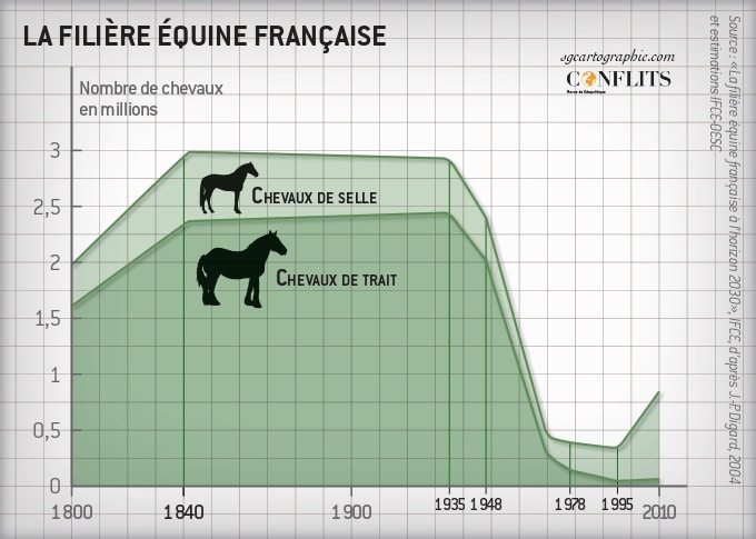 Normandie, comtés de Suffolk et de Norfolk en Angleterre, Connacht en Irlande et Basse-Saxe en Allemagne, quelques régions d’Europe concentrent les grands élevages de chevaux, des races taillées pour les courses et l’hippisme. De l’herbe, de la pluie, de la passion et des territoires façonnés par le cheval, non plus celui qui sert pour les champs ou pour les fiacres des villes, mais le cheval de course, qui galope et court après les prix. Le cheval construit les territoires où il est roi et draine derrière lui tout un écosystème : éleveurs, vétérinaires, selliers, maréchaux-ferrants, etc. De la même façon qu’il y a des terres de bovins et des terres de taureaux, certains terroirs vivent de la culture du cheval, qui modèle les mentalités, les façons de vivre, les constructions spatiales. En Normandie, l’élevage équestre marque les bâtiments entre l’élevage (haras), les centres équestres et les hippodromes, les lieux de reproduction (haras de Saint-Lô et du Pin), les villes de vente (Deauville). C’est une relation particulière qui se noue entre l’homme et l’animal, une relation de transmission et de respect. Manche, Orne et Calvados concentrent l’essentiel de la filière équestre normande, qui est elle-même la première en France. À l’ombre des vergers et des champs de lin, le cheval se fait un roi discret, mais régnant. La proximité de Paris explique cette appétence normande pour le cheval, la région fournissant un grand nombre de chevaux à la capitale au temps où ils étaient le moteur des voitures. La proximité de l’Angleterre y a aussi contribué, le voisin servant de modèle pour la mode des hippodromes nés au cours du XIXe siècle. La géographie des élevages anglais montre là aussi une concentration dans les proches couronnes de Londres, pour les mêmes besoins que Paris, avec en plus des élèves en Cornouailles et dans le nord de l’Angleterre, à proximité de l’Écosse. En revanche, au pays de Galles et de l’autre côté du mur d’Hadrien, le cheval est moins présent. Le cheval dessine des frontières culturelles autant que géographiques et utilitaires. C’est bien la ville et ses modes urbaines qui le façonnent, surtout quand le cheval de trait a perdu toute utilité. Ces terres de cheval sont aujourd’hui des terroirs de cultures, d’histoires et de passions.