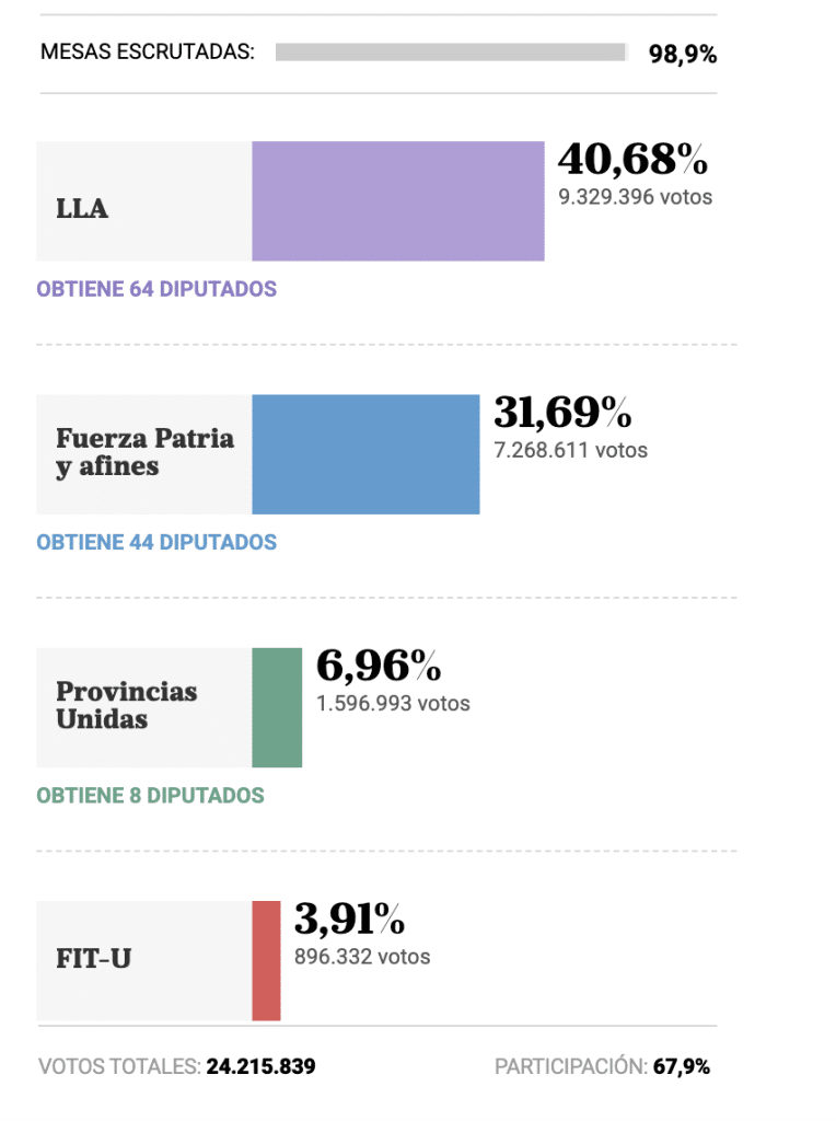 La Libertad Avanza, le parti de Javier Milei, a recueilli 40,7% des voix au niveau national, selon des résultats officiels à 97% du décompte, et est voué à quasi-tripler sa base parlementaire, sans pour autant atteindre la majorité absolue. Le parti péroniste obtient 31,6%, ce qui reste un très bon score. Mais il perd la province de Buenos Aires.