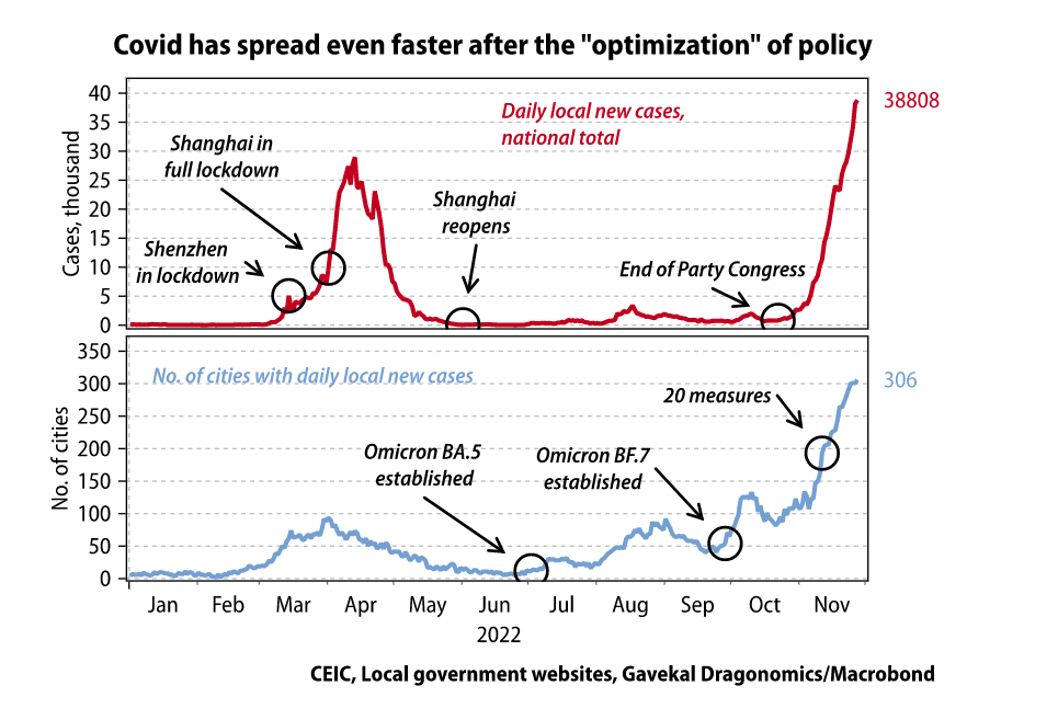 L’effondrement du système actuel a commencé à la fin du mois d’octobre, lorsque plusieurs villes, principalement dans les provinces occidentales, n’ont pas réussi à contenir efficacement les épidémies des nouvelles sous-variantes plus transmissibles du virus SRAS-CoV-2. Étant donné que la propagation du virus est déterminée par les mesures les moins efficaces, plutôt que par les plus efficaces, ces échecs localisés de l’efficacité administrative ont entraîné une propagation géographique beaucoup plus importante des nouveaux cas.