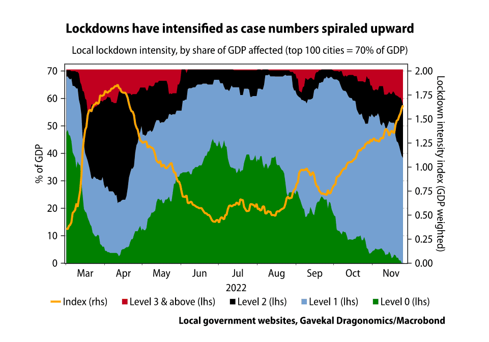 Le scénario le plus probable est plutôt celui d’un nouveau renforcement des contrôles dans la plupart des localités au cours des prochaines semaines afin d’éviter un pic massif de cas. Cela pèsera sur la croissance économique en novembre et en décembre, et toute protestation soutenue pèsera probablement aussi sur les marchés. En outre, il est de plus en plus évident que l’ampleur des restrictions imposées par le Covid à l’échelle nationale a désormais un impact significatif sur le transport et la logistique, et pas seulement sur les services de détail destinés aux consommateurs. L’indice Gaode du trafic routier interurbain a baissé ces dernières semaines et le gouvernement central a convoqué des réunions pour discuter de la manière de maintenir le fonctionnement des réseaux logistiques.