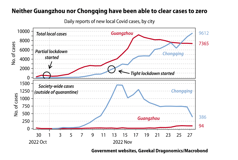 Deuxièmement, même des restrictions beaucoup plus sévères semblent désormais incapables d’éradiquer véritablement le Covid, probablement parce que les nouvelles sous-variantes sont devenues beaucoup plus efficaces pour se propager. Deux des plus grandes épidémies locales en cours se situent à Guangzhou et à Chongqing, qui enregistrent chacune des milliers de nouveaux cas chaque jour. Ces deux mégapoles ont eu recours très tôt et de manière agressive à des mesures de confinement résidentiel strictes, qu’elles ont maintenues même après les mesures d’optimisation, mais aucune d’entre elles n’a enregistré de réels progrès pour ramener les cas à zéro. Leurs épidémies ont peut-être atteint une taille qui rend impossible une éradication complète, car il y aura toujours un réservoir d’infection parmi leurs millions de résidents.