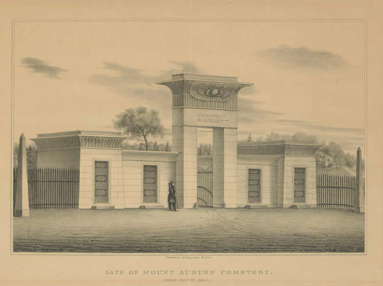 L’imprégnation égyptienne dépasse la sphère temporelle en s’appropriant le domaine spirituel et le souvenir des défunts. En effet, à partir des années 1820 un mouvement que l’on pourrait qualifier « d’Egypto-american way of death » (Joy Giguere) touche la réorganisation et l’embellissement des cimetières sur des critères similaires aux croyances funéraires pharaoniques. Dans l’idée de marquer le passage entre les deux mondes, les portes de certains cimetières comme celui de Mount Auburn de Jacob Bigelow en 1831 (Massachusetts) sont couverts de motifs égyptiens.
