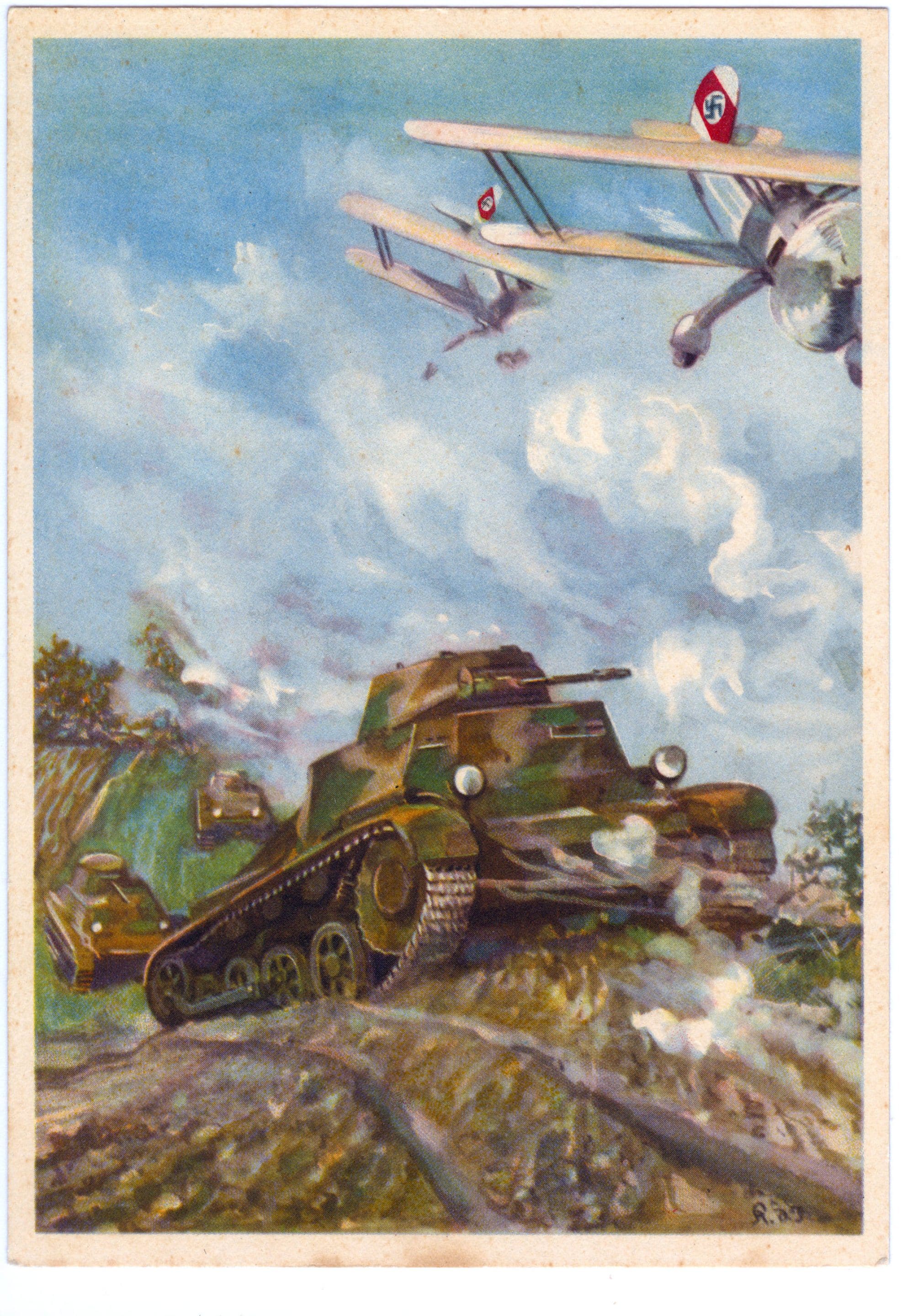 Les avions représentent probablement le Heinkel (He) 51, le premier chasseur de la Luftwaffe produit en grande série. Plus de trente He 51 ont servi au sein de la Légion Condor et, au total, plus de cent ont été utilisés en Espagne, sous différentes formes. Le char ressemble au Panzerkampfwagen 11 (Pzl I), dont le canon pouvait tirer des munitions perforantes et explosives. Le Pzl I entra en service début 1936, mais ne participa pas aux combats en Espagne. Date : vers 1937. © SIPA