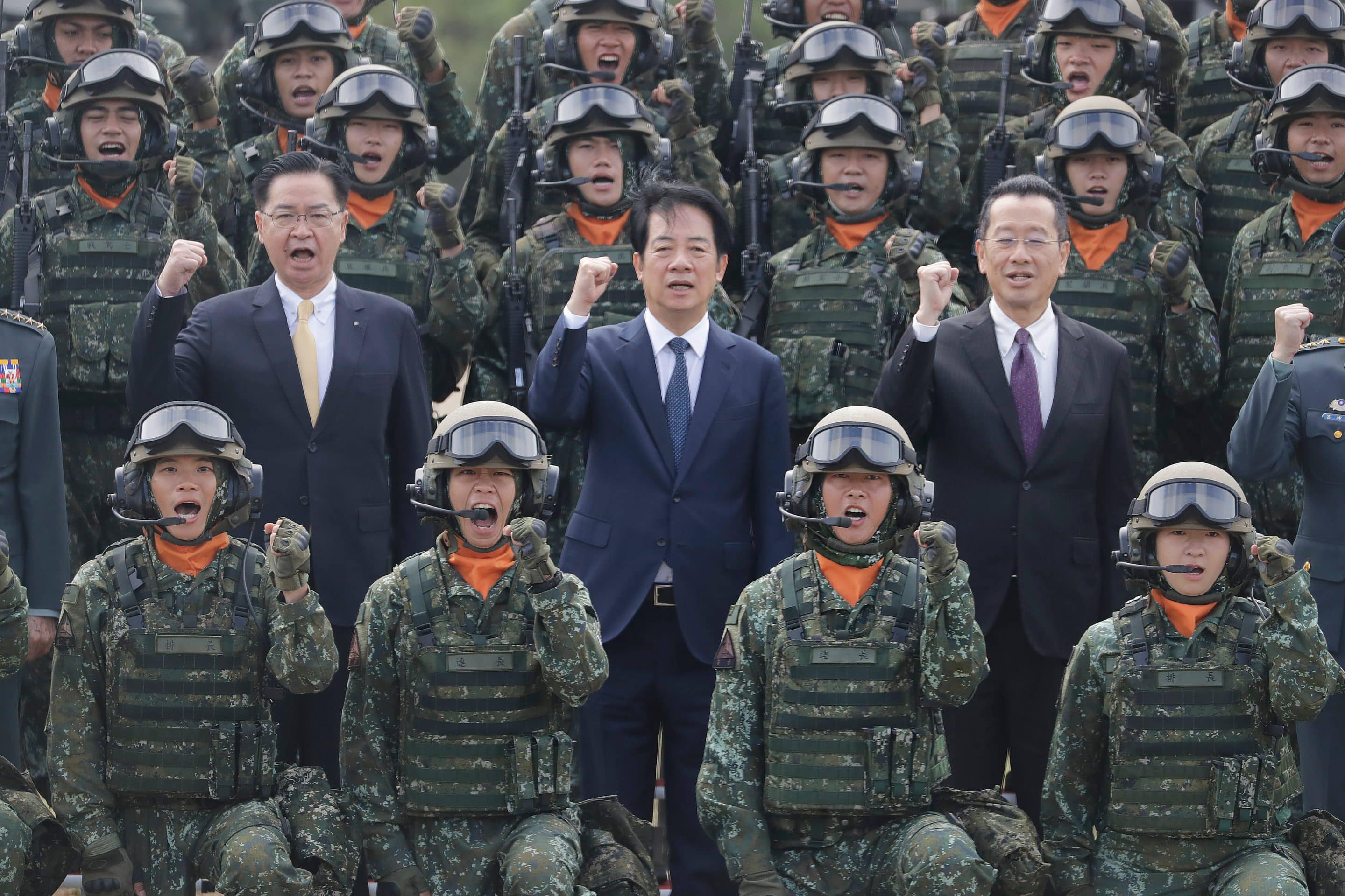 Le président taïwanais, Lai Ching-te, pose pour une photo avec des tankistes. 31 octobre 2025. (C) SIPA