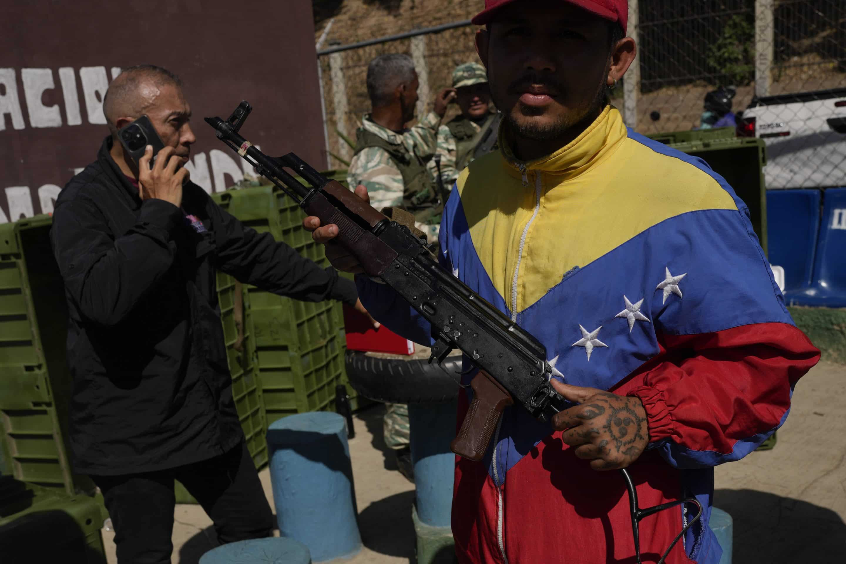 Membre d’une milice paramilitaire bolivarienne, portant une veste aux couleurs du Venezuela et un fusil d’assaut Mpi-KmS 72, janvier 2025, Caracas (AP Photo/Matias Delacroix) © SIPA