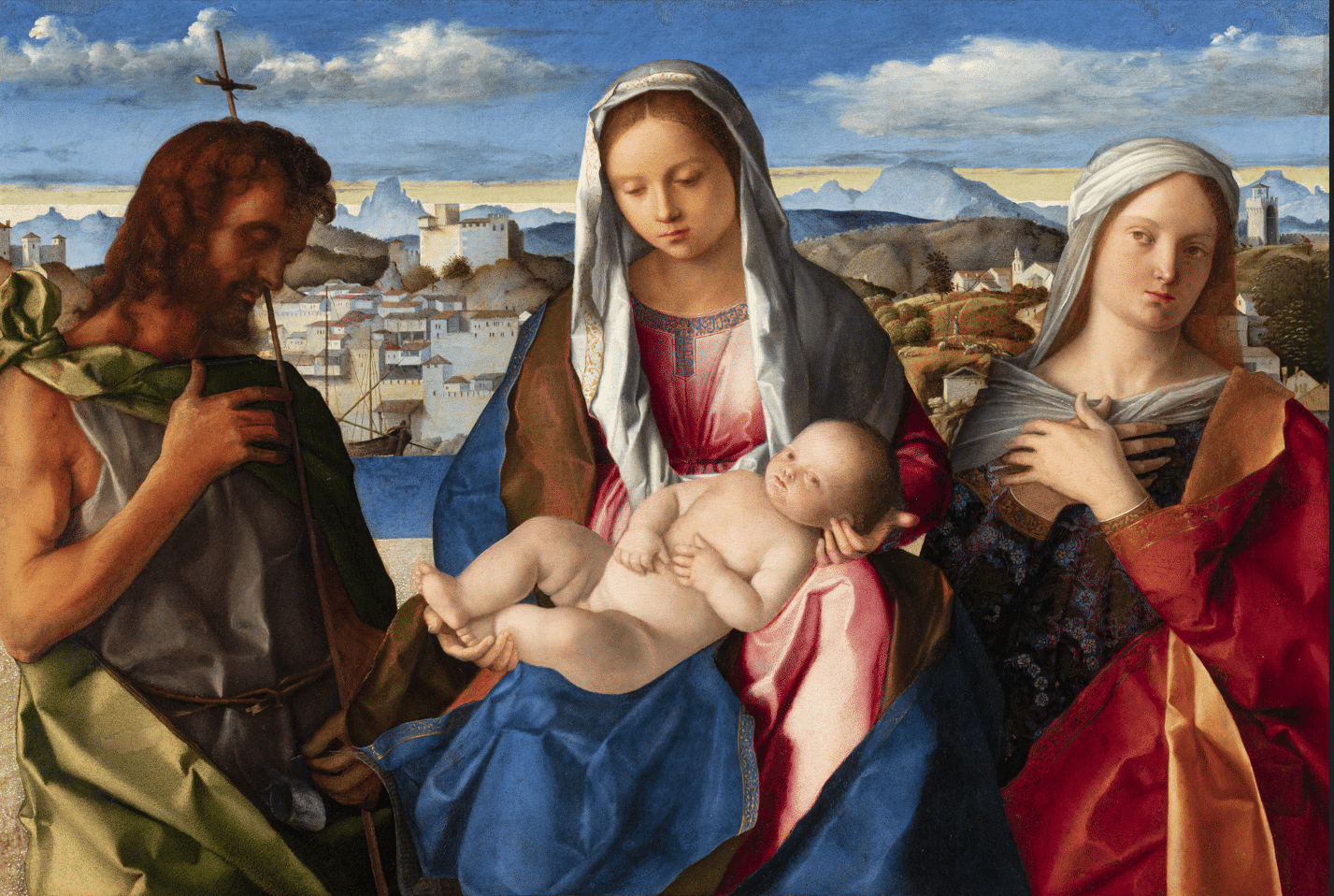 Giovanni Bellini. Vierge à l’Enfant avec saint Jean-Baptiste et une sainte (Sainte Conversation Giovanelli). Vers 1500. Peinture sur bois. 55 x 77 cm. Gallerie dell’Accademia, Venise. © G.A.VE Archivio fotografico – su concessione del Ministero della Cultura