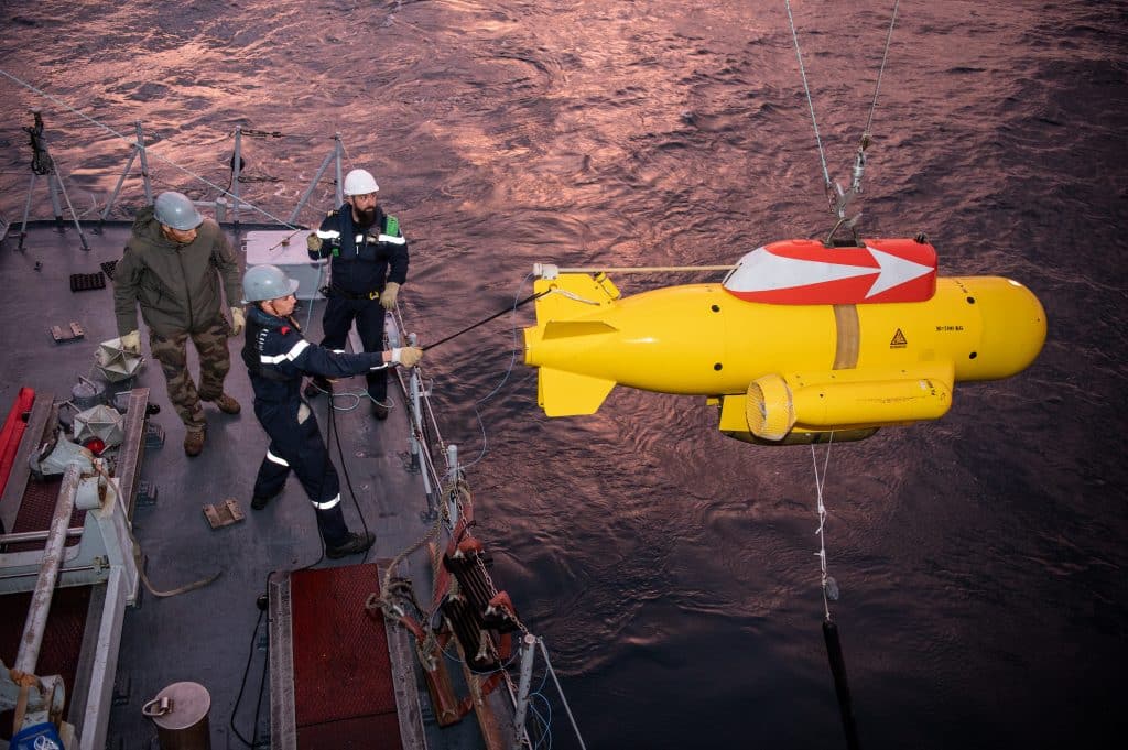 Mise à l’eau du poisson auto propulsé (PAP 104) afin d’effectuer une opération de levée de doute sur une potentielle mine sous-marine. Baie de Seine, le 11/10/2023. ©Olivier Nicolas/Marine Nationale/Défense