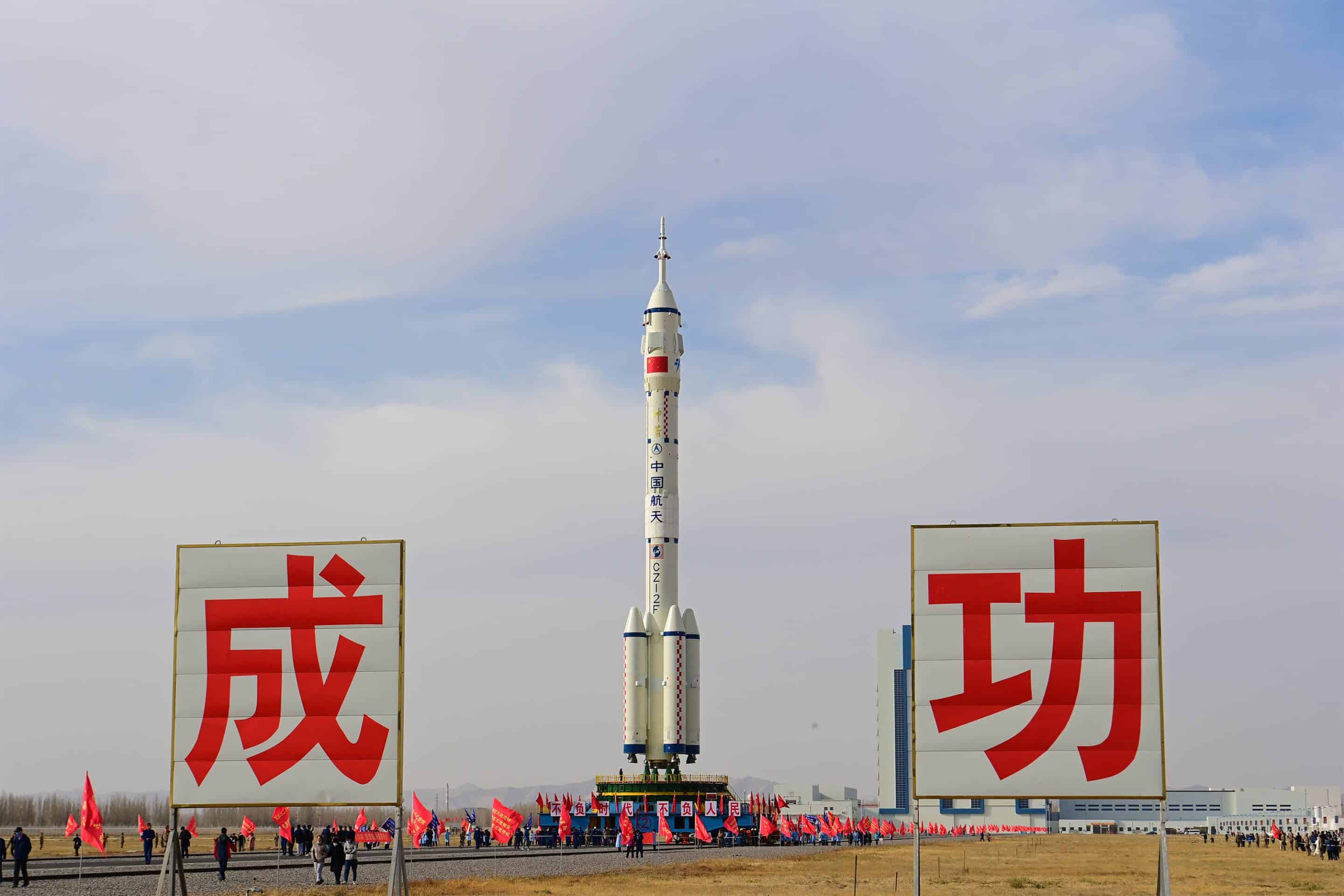 Photo : Le vaisseau spatial habité Shenzhou-15 et sa fusée porteuse Longue Marche-2F sont transférés vers la zone de lancement du Centre de lancement de satellites de Jiuquan, dans le nord-ouest de la Chine, le 21 novembre 2022. (Photo : Wang Jiangbo/Xinhua) © SIPA