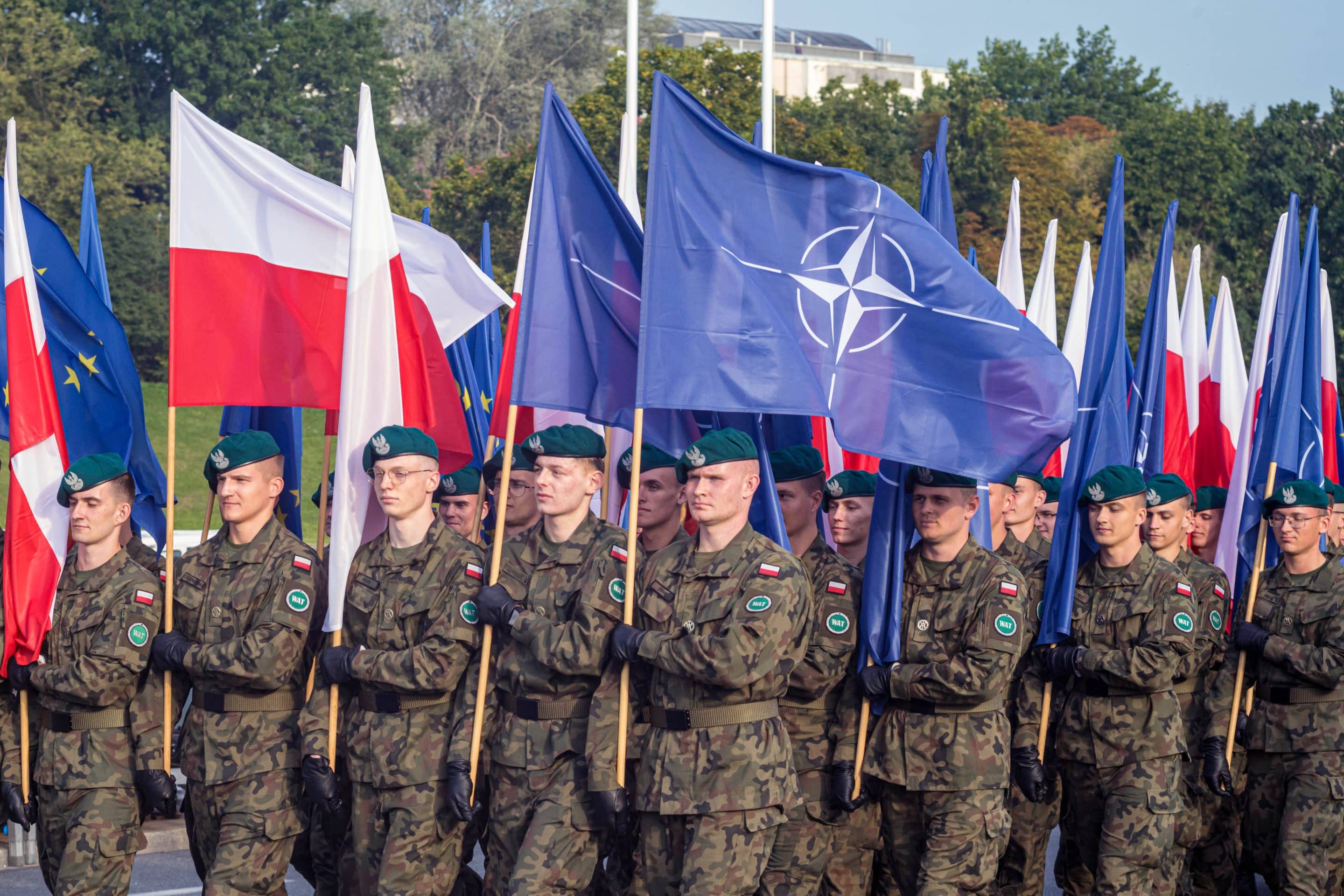 Des soldats polonais défilent avec les drapeaux de la Pologne, de l’OTAN ainsi que de l’Union Européenne. 10 août 2025, Varsovie, Pologne.
