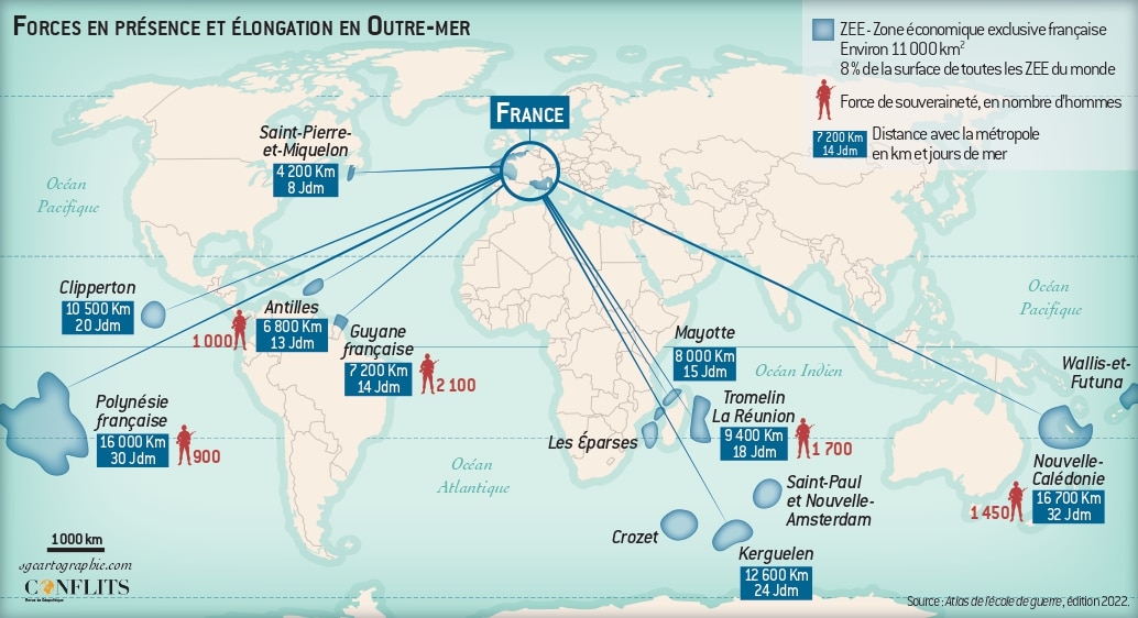 Compte tenu des distances et des moyens de la France, limités du fait de la multiplicité de ses engagements, la défense du grand large, pour l’armée de terre, commence d’abord dans l’océan Indien.