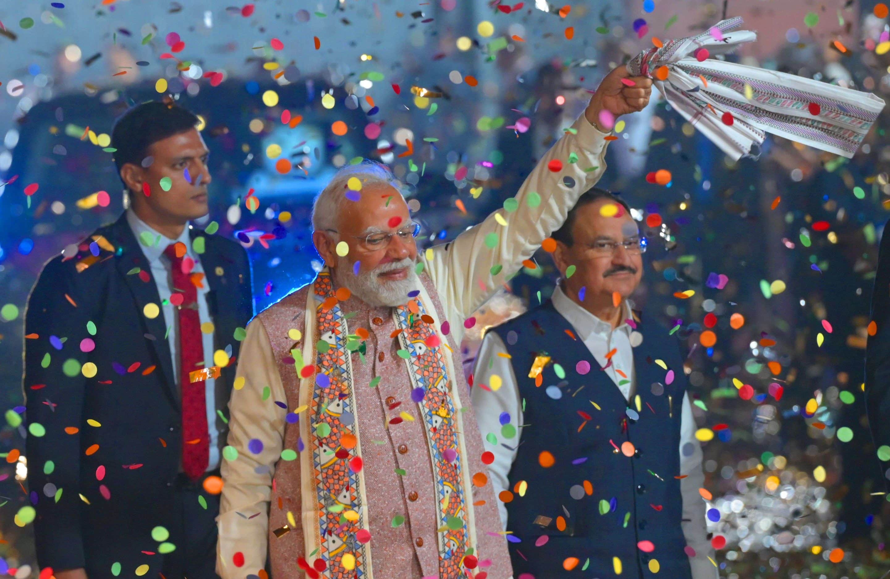 Le président indien Modi célèbre la victoire de son parti aux élections de l’Assemblée législative du Bihar. 14 novembre 2025. (C) SIPA