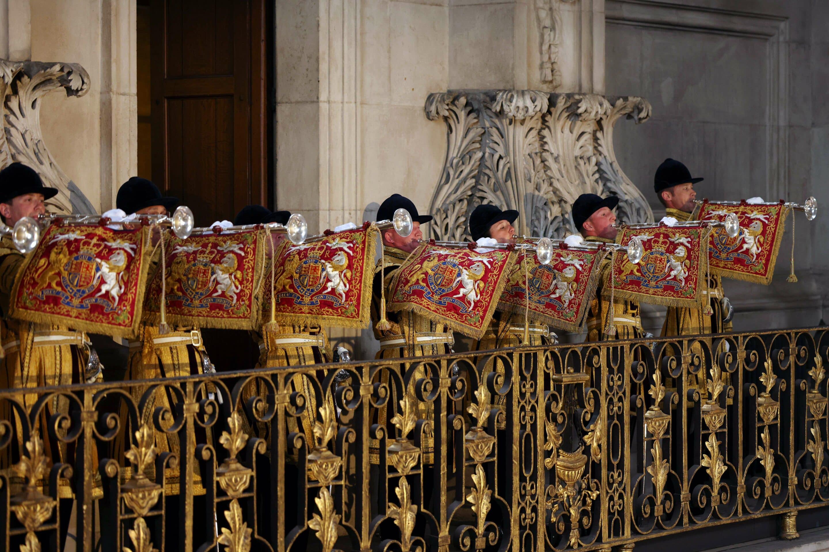 Trompettes aux armoiries d’Elizabeth II lors du National Service of Thanksgiving à la cathédrale St Paul, le 3 juin 2022 Crédits : Dan Kitwood/WPA Pool/Shutterstock