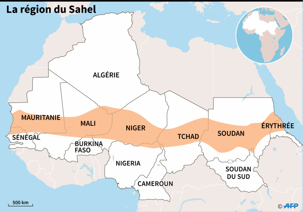 Le Sahel est une immense bande de terre qui s’étend entre le Sahara au nord et les savanes soudaniennes au sud. Long d’environ 5 400 kilomètres, il traverse le continent africain d’ouest en est, de l’océan Atlantique jusqu’à la mer Rouge. Habité par plusieurs peuples, c’est aussi un espace de transit