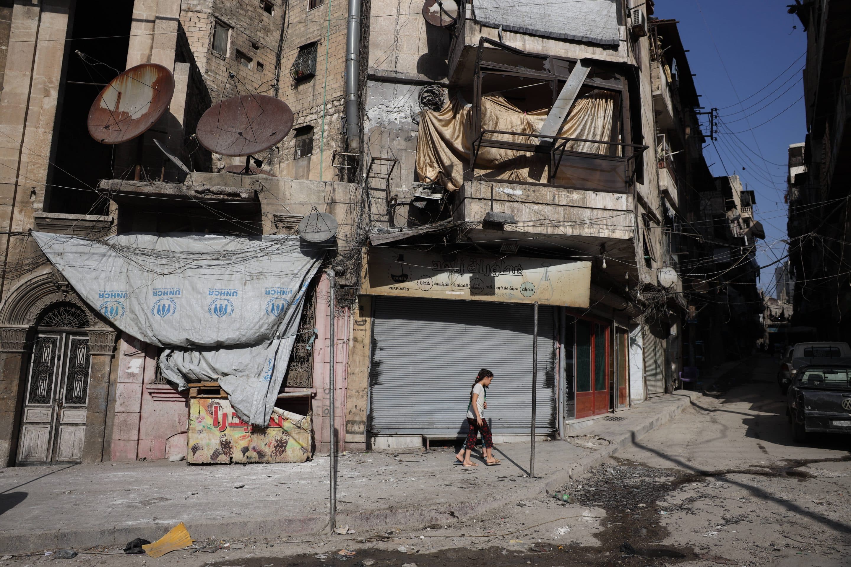 Une fillette passe devant des bâtiments endommagés dans le quartier de Midan à Alep, en Syrie, mardi 7 octobre 2025, après des affrontements nocturnes entre les troupes gouvernementales syriennes et les Forces démocratiques syriennes dirigées par les Kurdes. (AP Photo/Omar Albam)