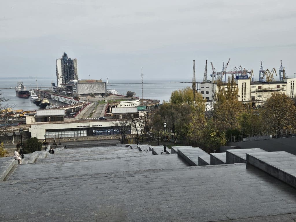 Au bas des escaliers du Potemkine, les terminaux du port d’Odessa. Des dégats sont visibles sur la tour hôtel. (c) JB Bless