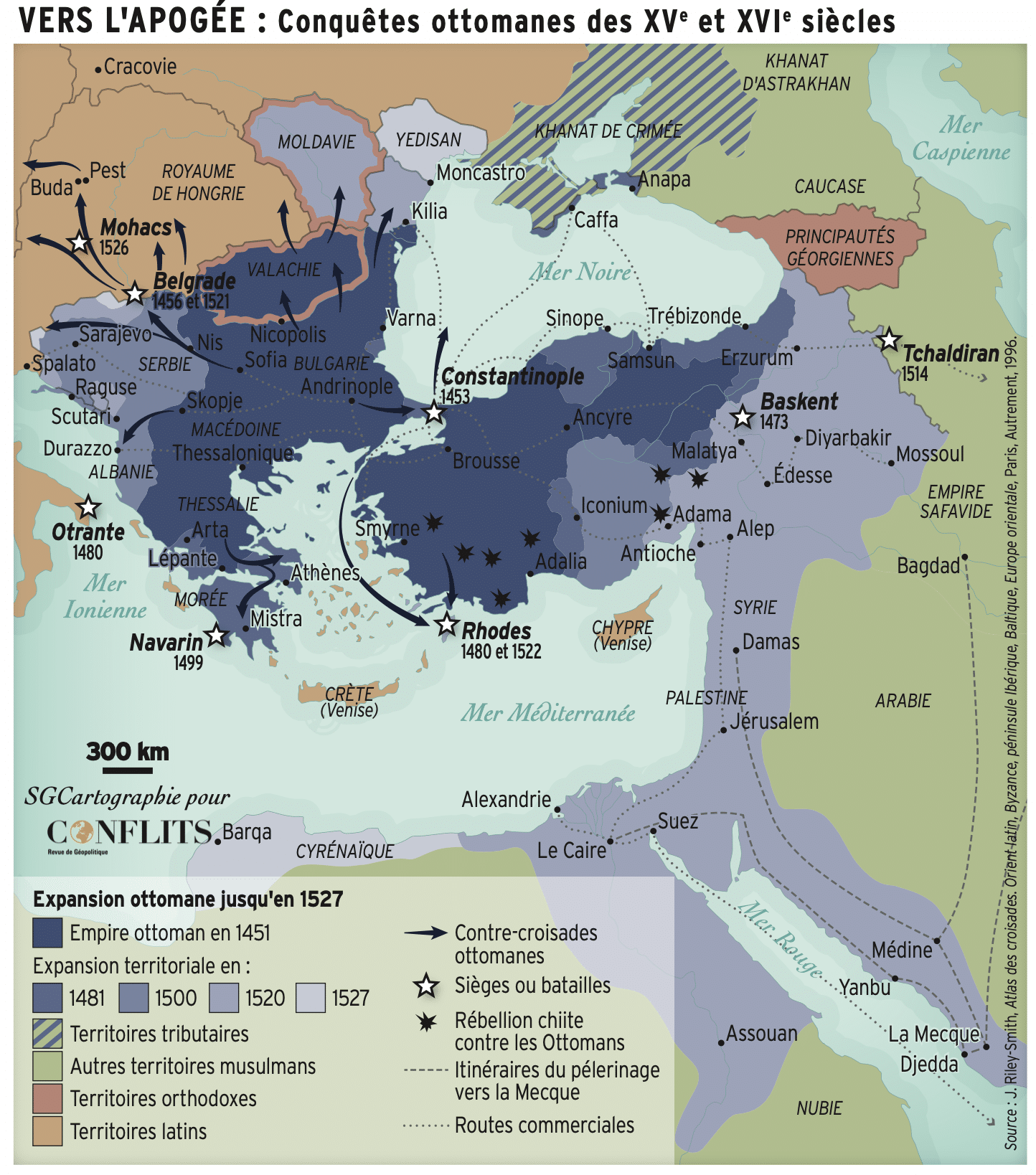 Dès 1350, le Sultan Orhan (1281-1362) traverse le Bosphore et subjugue la péninsule balkanique. Au gré des campagnes militaires, ses successeurs franchissent l’Égée, vagues après vagues. Dans l’imaginaire turc, la rive balkanique, ou Roumélie, représente la moitié de l’Empire : elle est l’une des plus anciennes conquêtes turques. À côté des Balkans, les provinces arabes ajoutées au début du XVIe siècle font figure d’annexions tardives. En Europe, les Ottomans coiffent la Thrace, la Macédoine, la Thessalie, la Bulgarie, auxquelles s’ajoutent l’Albanie, la Valachie, et une portion de la Serbie.