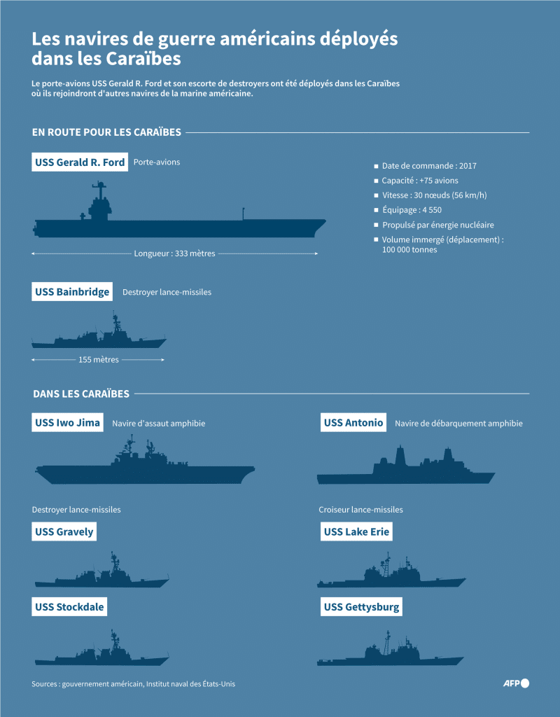 Une fois arrivé sur zone, le porte-avions rejoindra d’autres unités déjà stationnées dans les Caraïbes, dont le navire d’assaut amphibie USS Iwo Jima, le navire de débarquement USS Antonio, ainsi que les destroyers USS Gravely et USS Stockdale. Ces bâtiments seront appuyés par deux croiseurs lance-missiles, USS Lake Erie et USS Gettysburg, formant ainsi un dispositif naval complet mêlant projection aérienne, défense anti-missiles et capacités amphibies.