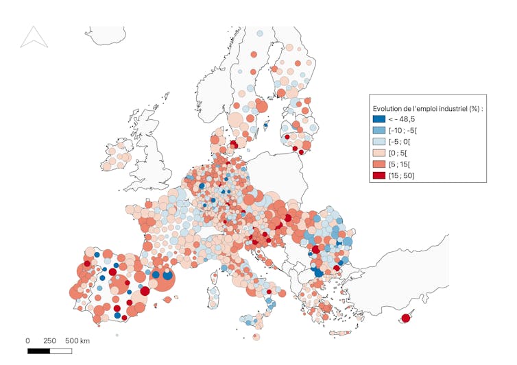 Même si ces quelques résultats soulignent la place prépondérante des villes dans ces dynamiques de relance industrielle, on sait que les effets de taille n’expliquent pas tout. Les cartes européenne et française soulignent les effets régionaux, auxquels s’ajoutent des effets sectoriels.