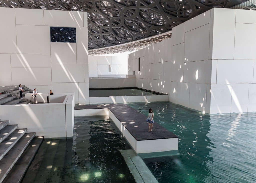 Le bâtiment lui-même a été conçu pour marquer les esprits. Dominé par une immense coupole ajourée de 180 mètres de diamètre, formée de milliers d’étoiles métalliques laissant filtrer la lumière, il fait du geste architectural un élément central de l’identité du lieu. Le musée est pensé comme une destination en soi, un emblème de la transformation culturelle de l’émirat, dans une enclave appelée à accueillir d’autres institutions majeures.