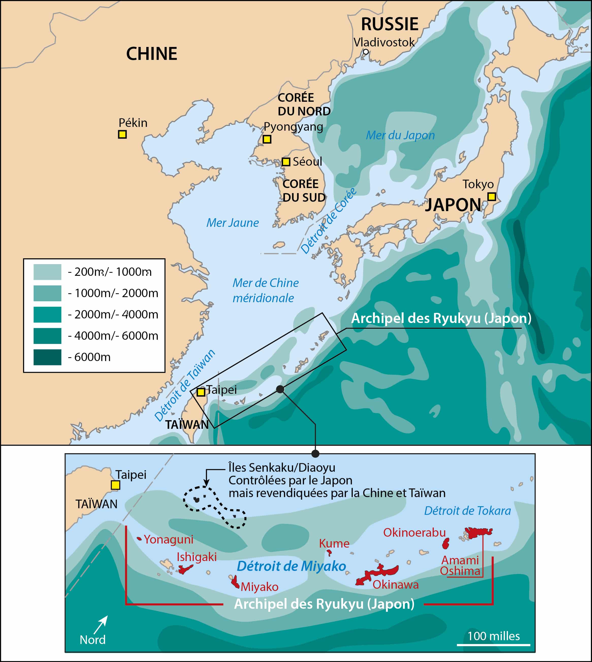La Chine pâtit d’une situation géographique singulière concernant son accès à l’océan. Ses côtes sont encerclées par des chapelets d’îles qui la séparent des eaux profondes : la « première chaîne d’île ». Pour les SNLE chinois, cette géographie complexifie leur accès aux grands fonds où ils pourraient se diluer et demeurer indétectables. Cet enclavement rappelle celui du bastion soviétique.