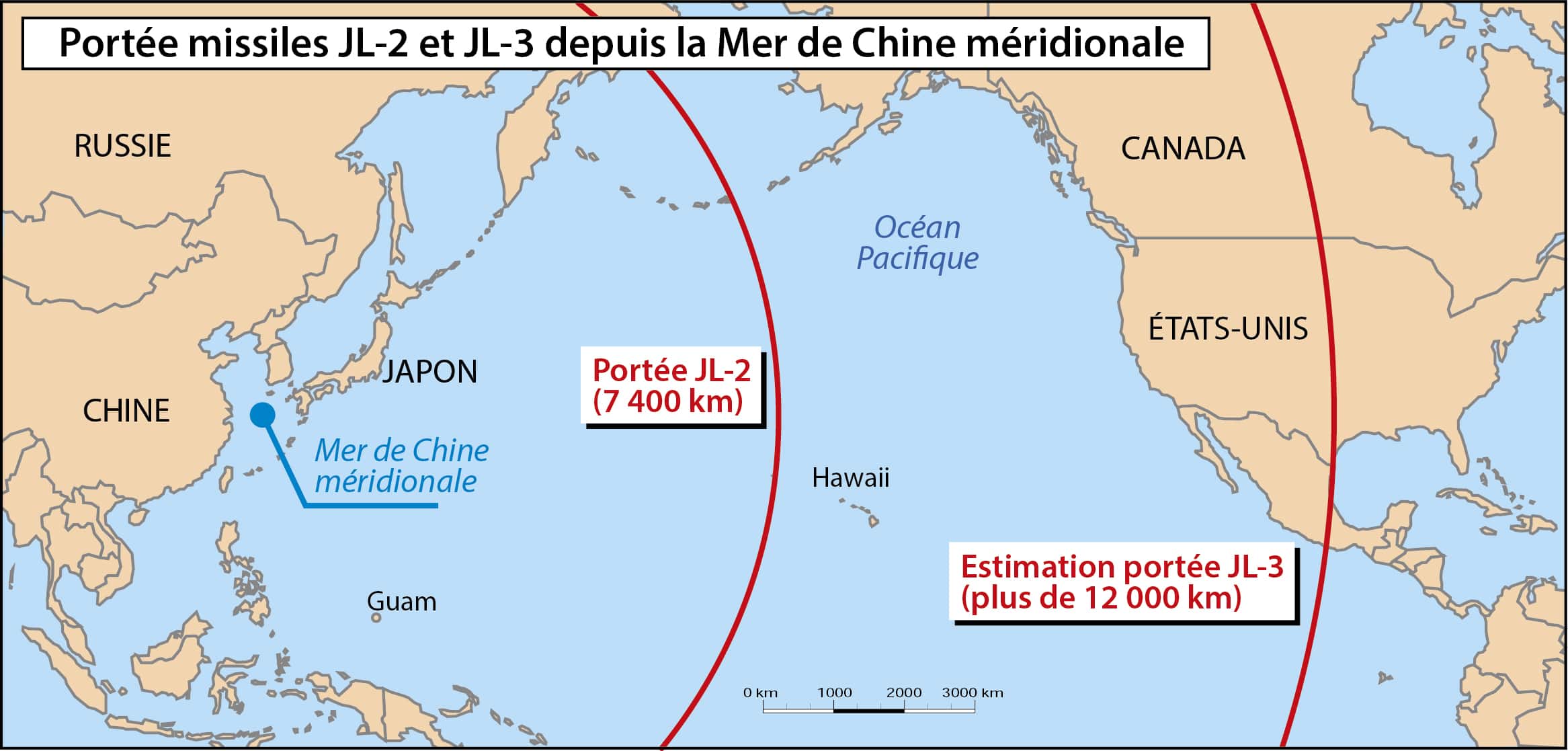 Face à cette situation, la stratégie chinoise vise en premier lieu à interdire l’accès à l’intérieur de la première chaîne d’îles. À cette fin, la Chine a investi fortement dans ses capacités d’interdiction : frappes en mer depuis les airs avec le nouveau missile aéroporté antinavire hypersonique YJ-21 ou frappes par les moyens de la force de mise en œuvre des missiles (PLARF2 ), notamment par les missiles DF21D et DF26 crédités de capacités antinavires à plus de 1 000 km, moyens de détection spatiaux, ou encore, militarisation des îlots de la MDCM. Ainsi, Pékin cherche à mettre en place un bastion comparable à la mer de Mourmansk qui lui garantirait la sécurité de ses SNLE. Reste la question de la portée de ses missiles. Or depuis mars 2022, l’US strategic command considère que les sous-marins chinois sont dotés de missiles de classe JL-3 dont la portée dépasserait les 12 000 km mettant un tiers du territoire américain à portée de la MDCM.