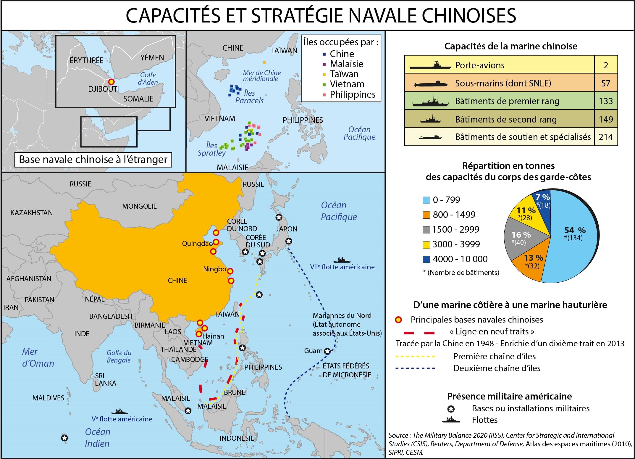 La dissuasion nucléaire est capitale dans le rapport de force entre les deux puissances et les récents efforts consentis par Pékin dans ce domaine face au durcissement des relations sino-américaines le confirment. Dans ce cadre, en Chine comme chez les quatre autres membres permanents du Conseil de sécurité de l’ONU, la permanence en mer de sous-marins nucléaires lanceurs d’engins (SNLE) indétectables garantit que même en cas d’attaque-surprise, aussi destructrice soit-elle, le pays sera en mesure d’infliger à coup sûr des destructions inacceptables à l’assaillant. Pékin possède des SNLE de classe Jin (type 094) dotés de missiles intercontinentaux JL-2. Cependant, cette capacité est entachée côté chinois par plusieurs fragilités : ces sous-marins ne sont pas réputés très discrets et les missiles JL-2 sont crédités d’une portée de 7 200 km, insuffisante pour atteindre le territoire continental américain depuis la mer de Chine méridionale (MDCM). C’est en effet le dernier point de fragilité chinois : la base des SNLE se situe sur la presqu’île de Hainan au cœur de la MDCM.