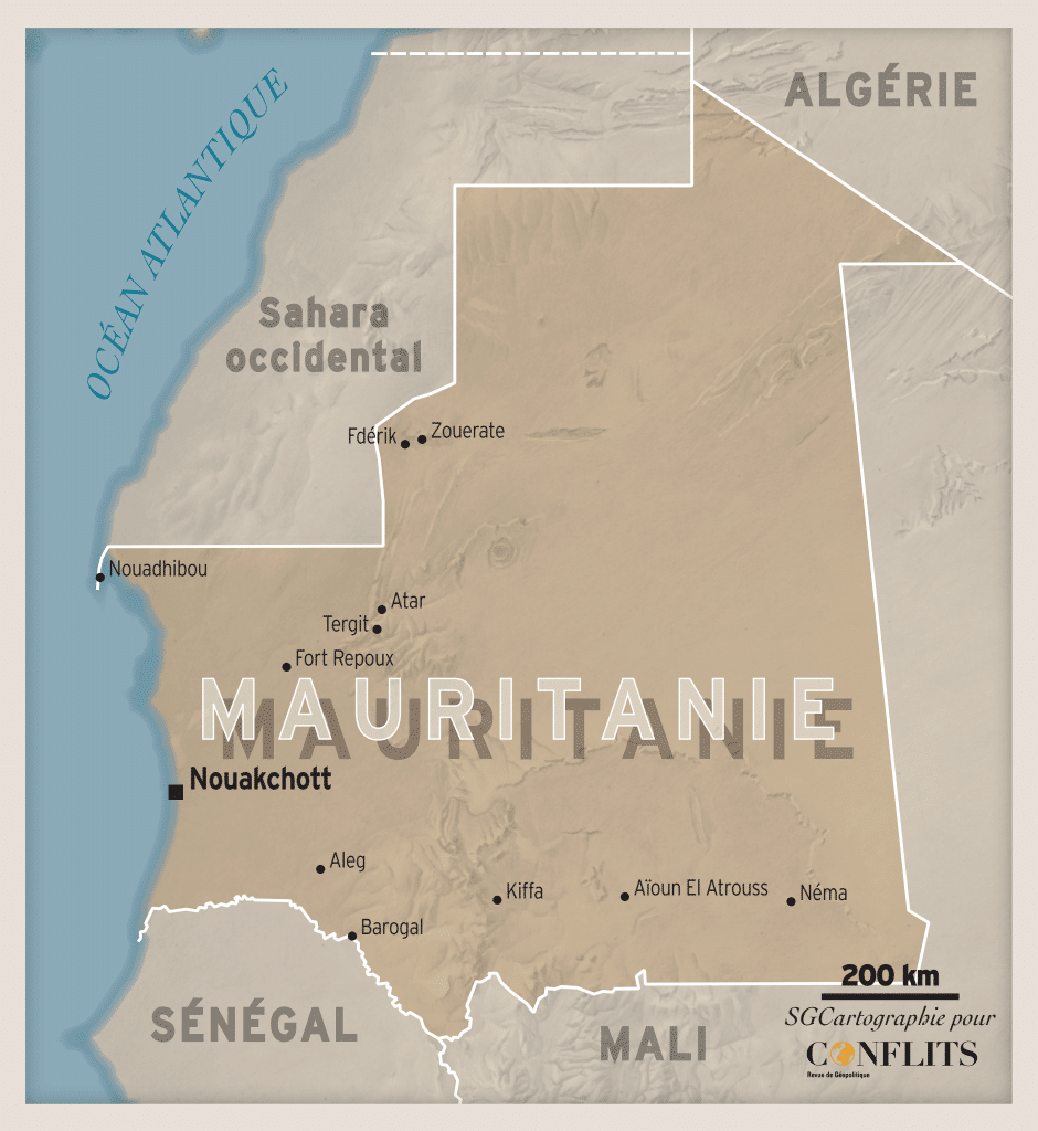 C’est un pays qui n’a pas 100 ans. Les Français, durablement installés en Afrique de l’Ouest, dominateurs du Maroc et de l’Algérie, voulurent maîtriser la région tampon et méconnue entre le nord du fleuve Sénégal et le Sahara maghrébin. Cet espace aride, traversé par les caravanes, fut baptisé Mauritanie, en référence aux Maures qui le peuplent, et administré depuis Saint-Louis à partir de 1904. En 1957, le territoire bénéficia de la loi Defferre et la Mauritanie naquit en 1960. C’était surtout un moyen pour la France de priver le royaume marocain de son rêve de « Grand Maroc », limitant son extension au sud en créant un État mauritanien.