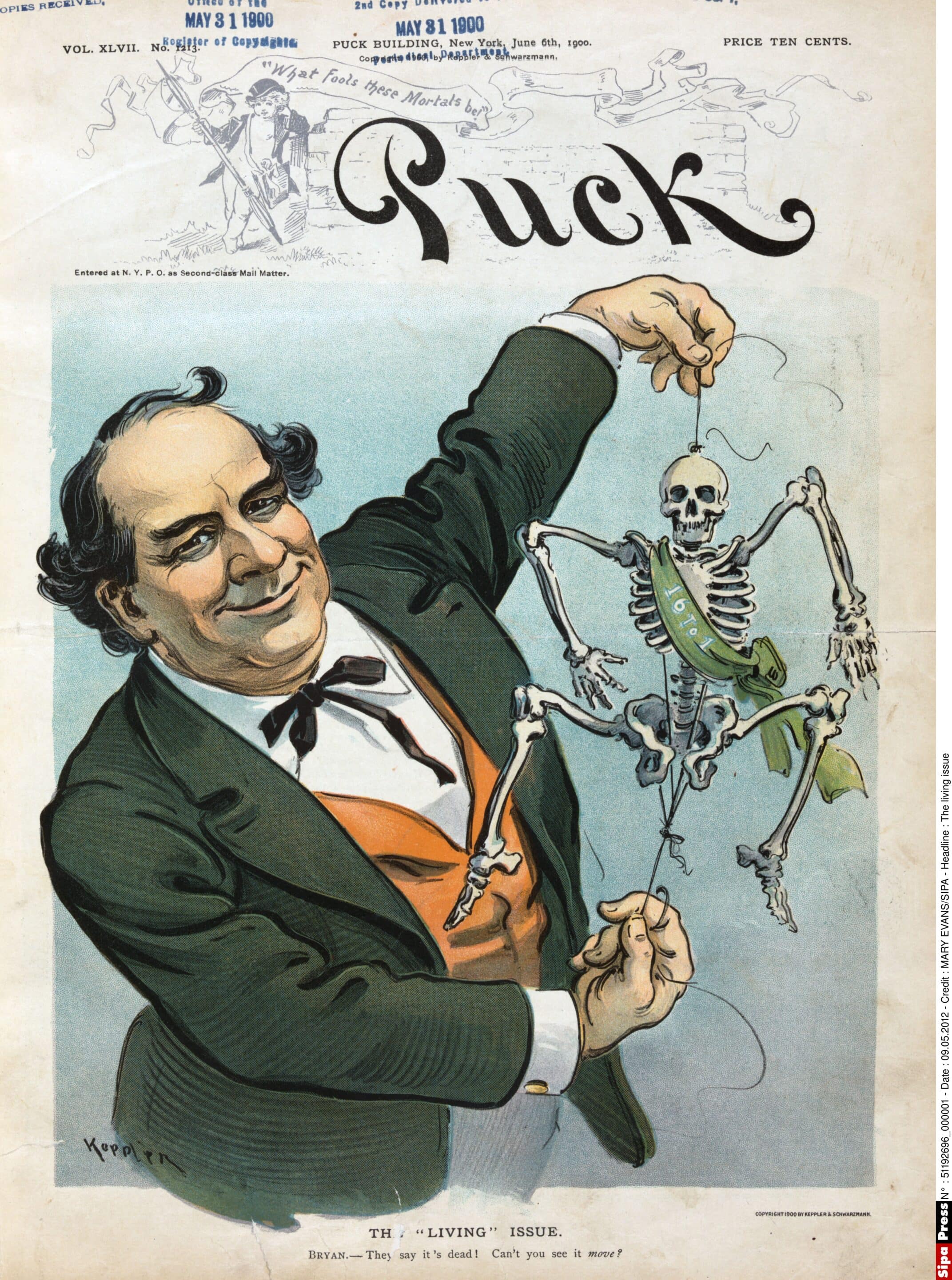 Illustration montrant William Jennings Bryan tirant sur des ficelles attachées à un squelette. 6 juin 1900. (C) SIPA