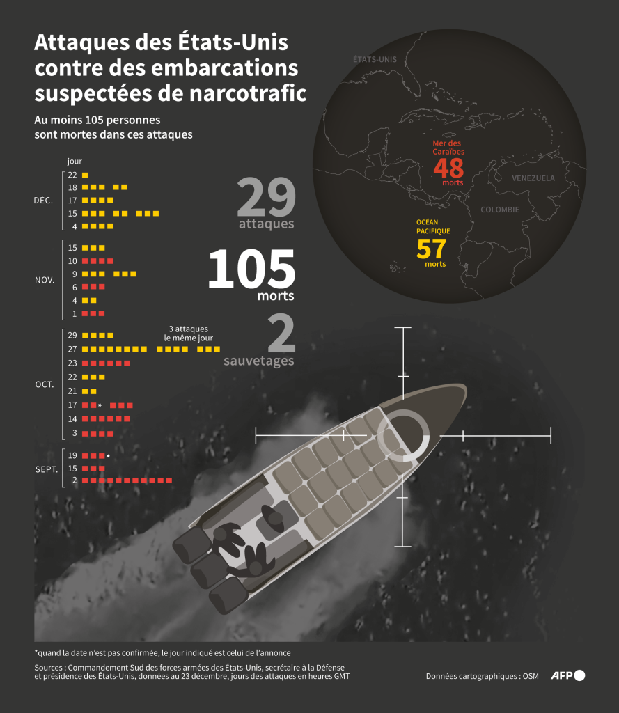 Cette carte met en lumière l’intensification des opérations militaires américaines contre des embarcations soupçonnées de narcotrafic en mer des Caraïbes et dans l’océan Pacifique oriental. Entre septembre et décembre 2025, ces interventions ont donné lieu à 29 attaques, provoquant la mort d’au moins 105 personnes pour des opérations officiellement présentées comme relevant de la lutte antidrogue.