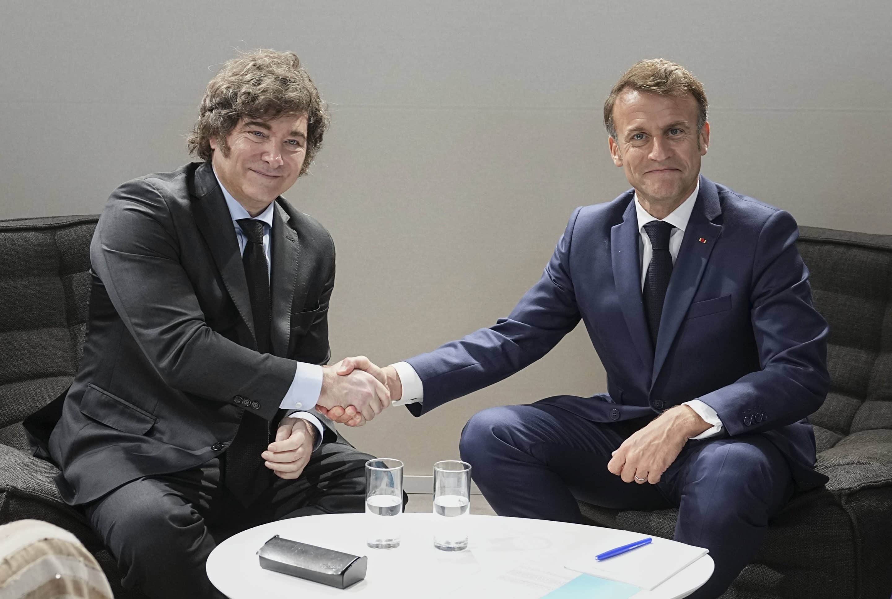 Javier Milei et Emmanuel Macron avant la troisième conférence des Nations-Unies sur l’Océan. 9 juin 2025, Nice, France. (AP Photo/Laurent Cipriani, Pool)