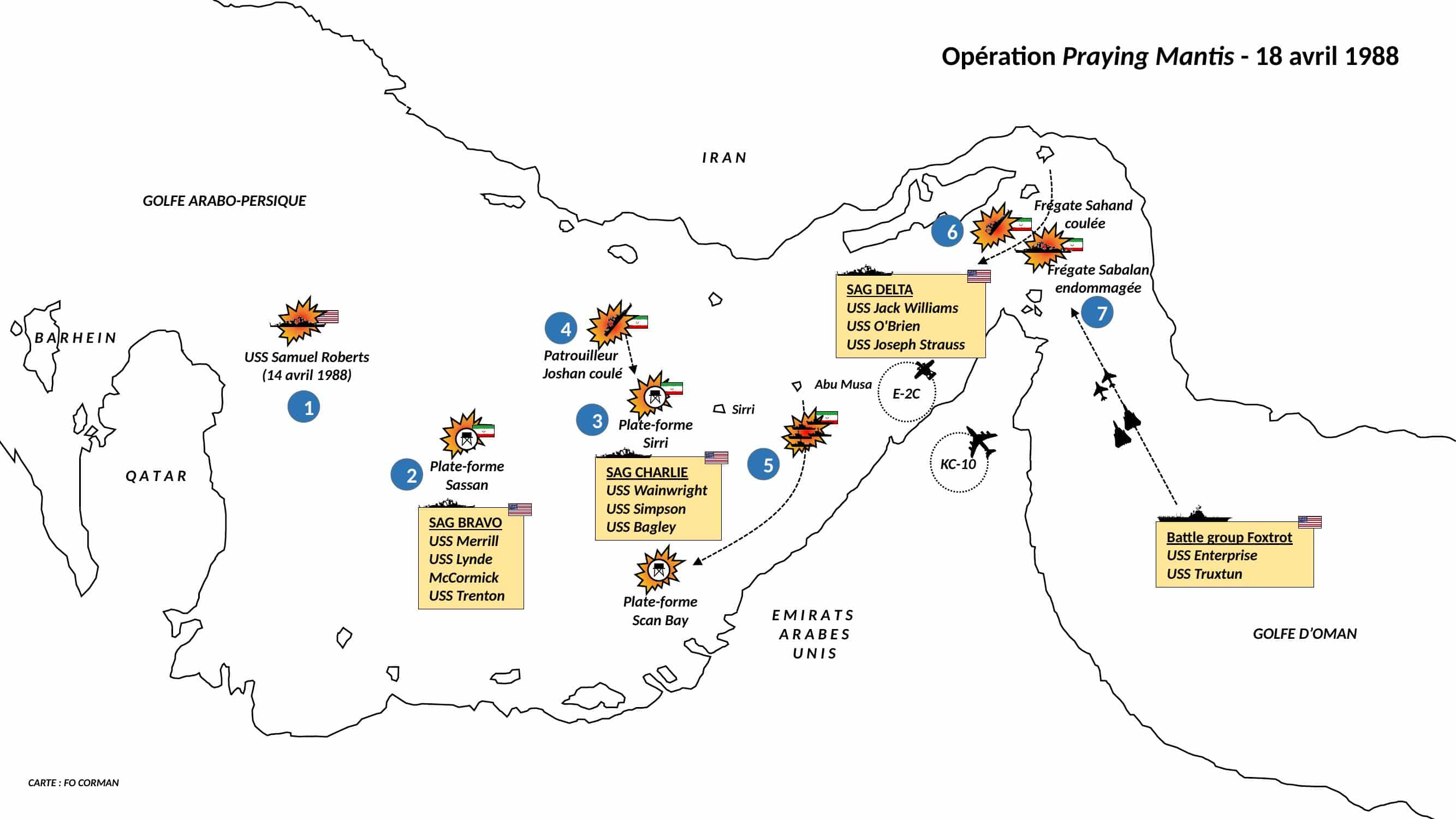 L’opération Praying Mantis (18 avril 1988) reste la plus importante action de combat naval américaine depuis 1944 : en quelques heures, l’US Navy détruisit la moitié des capacités navales iraniennes, mettant fin à la guerre des pétroliers dans le golfe Persique.