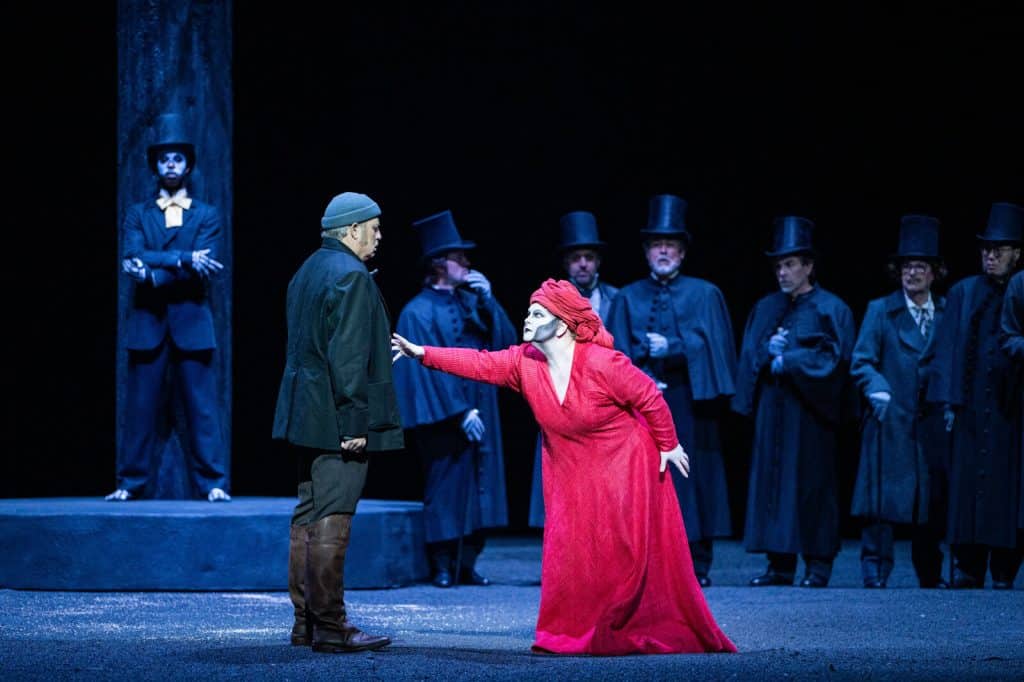 Au prix d’une étrange transposition à Boston à la fin du XVIIe siècle, auprès d’un « gouverneur de Boston, comte de Warwick » (Riccardo chanté par le ténor américain Matthew Polenzani), Verdi et son librettiste ont tout de même réussi à conserver les aspects les plus dramaturgiques : la devineresse Ulrica ( la mezzo américaine Elizabeth DeShong), l’assassinat et bien sûr l’adultère, même si Renato (le baryton québécois Etienne Dupuis) laisse entendre qu’il n’a pas porté atteinte à la vertu d’Amelia… La mise en scène de l’Opéra Bastille procède encore à une transposition dans l’Amérique du XIXe siècle, dans un décor unique et synthétique montrant une salle d’audience d’une froide architecture néo-classique évoquant le président Lincoln et l’aigle américain (Pluribus Unum, le thème est très à la mode !). De l’autre, le domaine d’Ulrica avec ses totems surmontés d’aigles faisant dos à la salle est le lieu obscur d’un culte vaudou. C’est de là qu’Elizabeth DeShong entame son « Re dell’ abisso, afrettati », air redoutable qui, ce soir, ne parvient pas tout à fait à créer la surprise et l’effroi. La soprano Sara Blanch avec une voix un peu légère interprète Oscar tandis que Andreas Cascante, Blake Denson et Christian Rodrigue Moungoungou font entendre un trio de barytons conspirateurs. Cheveux roux sagement nattés, la cheffe d’orchestre Speranza Scappucci fait merveille. Sa direction vive et précise, son attention constante au maintien de l’équilibre entre l’orchestre et le plateau sauvent la mise. Dans cette production, il ne fait aucun doute que c’est elle qui conduit le bal.