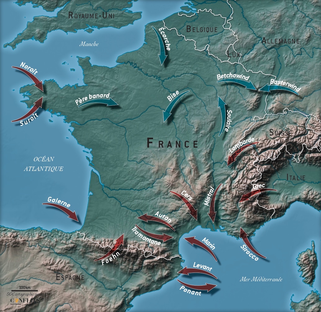 « Une cinquantaine de bâtisses mitoyennes, dont la blancheur n’était restée que dans leur nom, bordaient cinq ou six rues sans trottoir ni bitume ; rues étroites à cause du soleil, tortueuses à cause du mistral. » Ainsi Marcel Pagnol décrit-il les Bastides Blanches dans Jean de Florette, là où se joue le drame du village de Provence. Le mistral, l’un des trois fléaux de la Provence, violent et froid, descendant du nord le long de la vallée du Rhône. Un vent redouté que le géographe Strabon (60-20) décrit en ces termes dans sa Géographie : « […] il souffle dans l’étendue, surtout de la Crau, un vent septentrional d’une violence horrible. On dit qu’il ébranle et qu’il entraîne les pierres, qu’il enlève les voyageurs de dessus leur voiture, et qu’il leur arrache leurs armes et leurs habits. » Le vent façonne les paysages, modèle les crêtes, provoque l’organisation humaine. Les hommes peuvent chercher les vents favorables, ceux qui apportent la pluie pour l’irrigation, l’énergie pour la navigation ou au contraire se protéger des vents qui nuisent à son implantation. Si les techniques modernes permettent désormais de s’en affranchir, tant pour le transport que pour la construction, les terroirs de France conservent la trace des aménagements conditionnés par les vents.